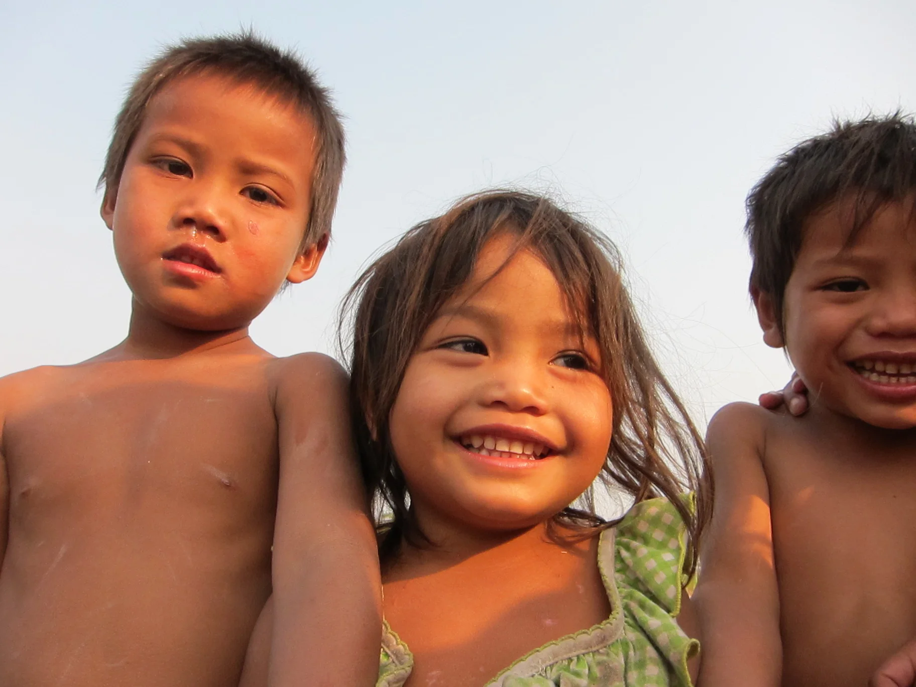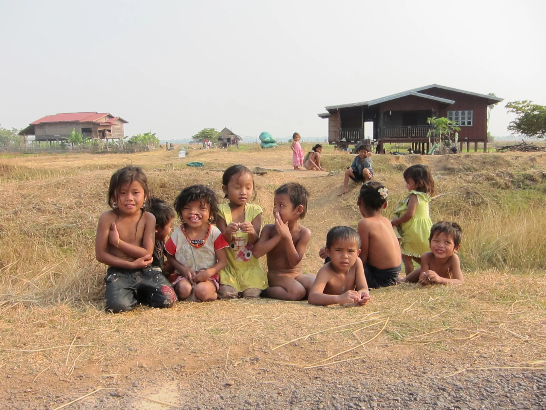Up ahead, a group of kids play by the side of the road; an older woman watches from an elevated hut. As we get closer, their faces become more distinct: one of the girls has a cleft lip. Some wear ragged clothing; others wear nothing at all. They tiptoe towards us, cautiously.